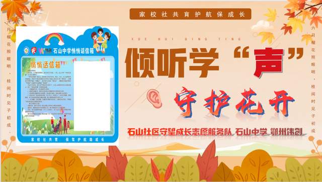 为积极推进家校社协同共育机制落地社区,实现“关心关爱未成年人,家校社共育护成长”的整体工作目标,通过开通一条心理咨询服务热线、设立一个悄悄话信箱,双管齐下,落实青少年心理健康教育。2024年6月4日,鄂州伟创携手石山社区守望成长志愿服务队、石山中学师生在石山社区共同开展“倾听‘学声’ 守护花开 共育成长”主题活动,前来参加活动的人员有西山街道党工委委员汪洁、驻社区工作组熊学敏主任、石山社区党委书记黄慧、石山中学团委胡书记、学生表、家长代表、鄂州伟创社工共20余人。