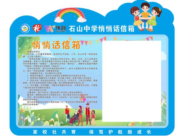 六月榴花照眼明,枝间时见子初成。今天,石山中学“悄悄话信箱”正式投入使用了。“悄悄话信箱”的设立,将学校与学生、家长、社区、社工站等多向沟通渠道向学生开放,为学生们开启了一条能够说说心里话、透露“心中小秘密”的途径。