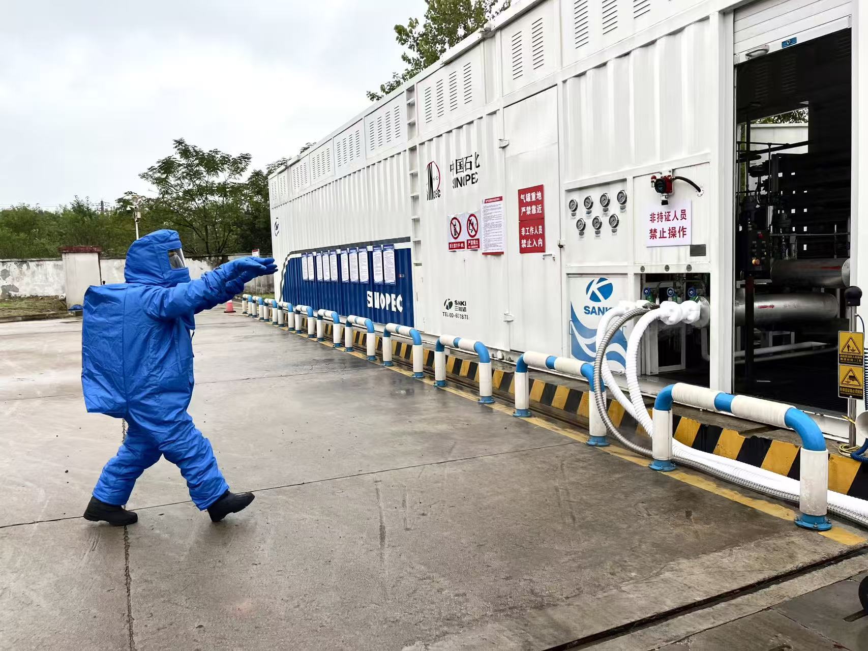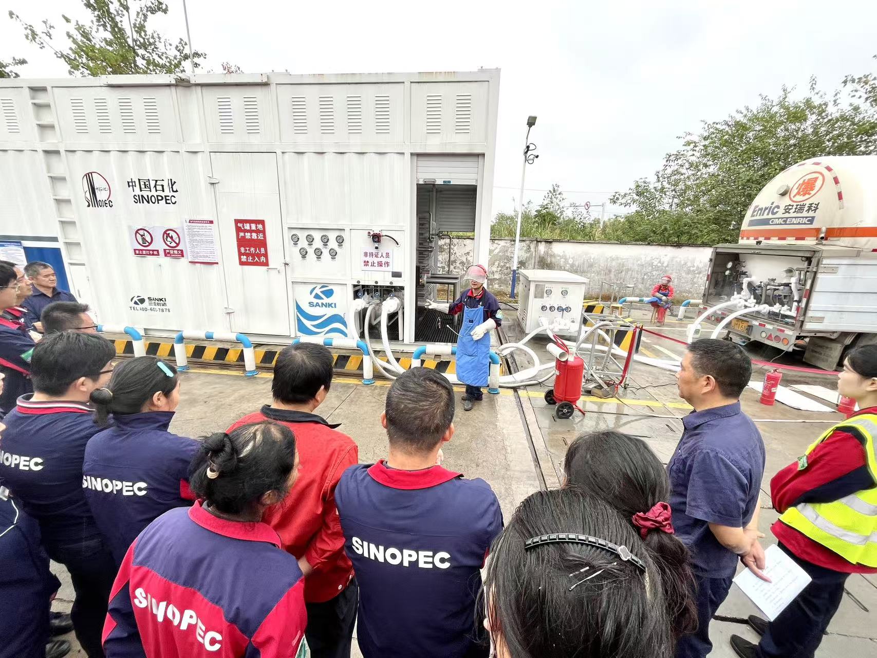 演练模拟加气过程中突发泄漏场景,警报响起后,现场员工迅速响应:警戒组立即划定安全区域、疏散无关人员,操作组依规关闭阀门、切断气源,技术组携带设备检测泄漏点并实施应急处置,各环节衔接紧密、行动迅速。