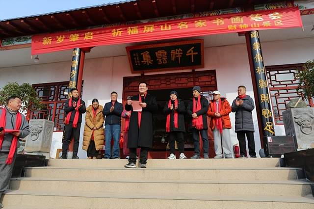 屏山风景区总经理王昭欣首先致辞,感恩父亲(王广成董事长),用大半辈子心血,投入到屏山风景区,他饱含对这片土地的热爱与对艺术的珍视,王昭欣深情说道:“屏山不仅拥有喀斯特地貌的奇绝风光,更沉淀着厚重的土司文化与红色基因。而坐落于景区内的财神山,更是我们枣庄市市中区一方难得的福运宝地。它静踞齐鲁,佑护四方,承载着百姓对富足安康的朴素祈愿,也为我们这片山水注入了祥和的人文气息。此次以书画笔会串联民俗文化节,既是对中华优秀传统文化的传承,更是让山水之美、福地之灵与艺术之韵相互成就的创新实践。”