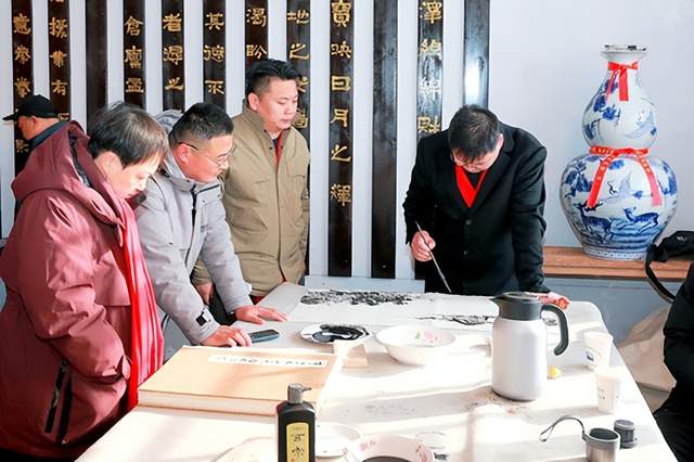 活动现场,主办方刘津特别设置了新春福礼赠予环节。中国书协考级中心专职考官,山东书协篆刻委员副主任翟卫民先生、中国楹联协会理事,影视剧美术主创刘师哲先生、中国美术家协会会员,枣庄民盟画院院长徐隆先生、枣庄美术家协会副主席白青龙先生、枣庄书法家协会艺术顾问,鼎新美术馆副馆长马伟先生、枣庄书法家协会副主席刘毅先生、中国宗教文化体裁课题组创立人,山水职业画家顾原先生、中国艺术研究院研究 郭丹女士,八位书画名家亲笔题写的新春真迹祝福卡,带着墨香与暖意送到游客手中,每一笔都凝聚着对新年的美好祝愿,让大家在收获艺术惊喜的同时,深切感受到传统节日的浓厚氛围。随着鸣炮声响,这份“翰墨福礼”传递着顺遂安康的期许,成为2026年元旦佳节最动人的文化印记。