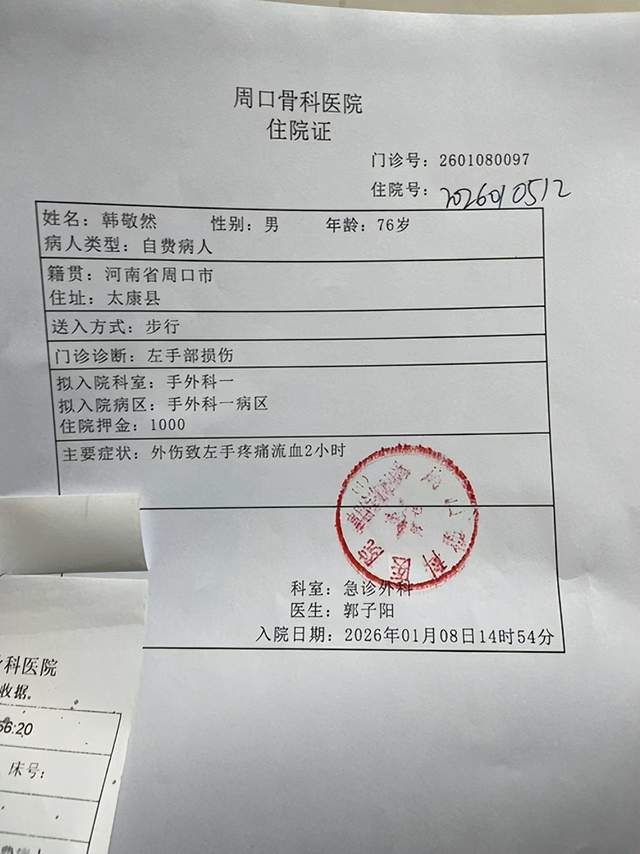 2026年1月8日中午12点多一名77岁老人在家劳作时手部划伤,血流不止,求救路人至村部求助后,村委支部书记韩中洲二话没说迅速驾车将其紧急送往太康县永兴医院,全程仅用20分钟。