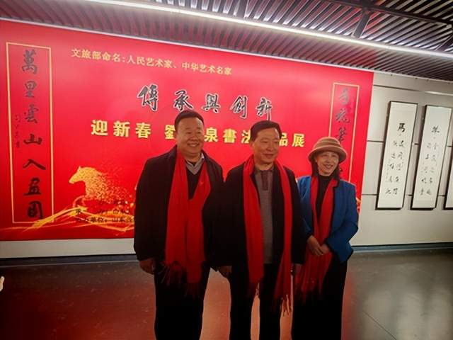 随后,“人民艺术家”、山东天衢书画院院长刘啸泉先生登台,向所有来宾作了深情而真挚的汇报与致谢发言。他首先回溯了自己自八岁执笔伊始,长达五十余载不曾间断的艺术跋涉之路。这条路上,有临池不辍的汗水,有探索求变的思索,更有始终恪守“做好人,办好事,写好字”的人生信条,笃信“身正笔直,字如其人”的内心修为。刘啸泉坦陈,自己的艺术生命根植于对经典碑帖的深耕与固守,在传统的沃土中汲取无尽养分;同时,他的艺术视野又始终朝向时代精神的淬炼与求索,勇于在博采众长的基础上进行不拘泥于古的创新实践。在介绍本次展出的作品时,他重点提及了两件具有特殊意义的力作:一件是被北京人民大会堂管理局正式收藏的宏篇巨制《沁园春·雪》,这件作品以其磅礴气势与精湛技艺,体现了国家殿堂级艺术认可;另一件则是他怀着对中国共产党的深深敬仰,于党的百年华诞前夕,倾注巨大心血创作完成的长达108米的书法长卷《中国共产党章程》全文。这份长卷不仅是技艺的考验,更是信仰与忠诚的笔墨凝结,其创作过程本身即是一次深刻的精神洗礼。发言最后,刘啸泉对多年来关心、支持、帮助他的各级领导、各界朋友及同仁表达了诚挚的感谢。