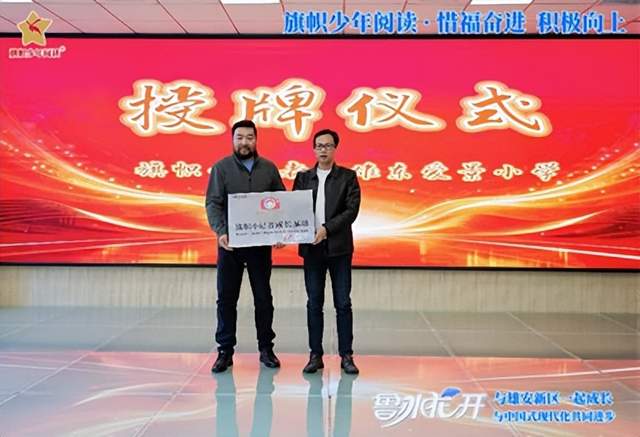 旗帜小记者创始人杜海义(左)为雄安雄东爱景小学授“旗帜小记者成长基地”牌,雄安雄东爱景小学校长姜军(右)接牌