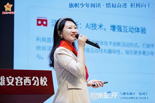活动现场,中国作家协会会员、著名儿童文学作家鲁冰老师,旗帜少年阅读创始人杜海义先生,旗帜小记者联合创始人孙晓颖老师,旗帜小记者北京事业中心主任陈立鹏老师,旗帜少年阅读校园主理人杜娟老师以及雄安容西云溪小学校长张春伶、容城县东牛小学校长彭玉战等嘉宾齐聚一堂,与师生们共同开启这场温暖的文学之约。少先队员们为鲁冰老师与各位领导嘉宾献上鲜艳的红领巾,以最纯真的敬意,迎接文学名家的到来。